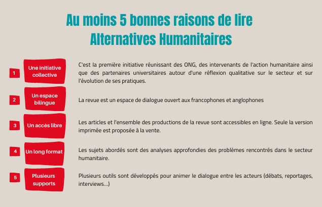 Ce numéro comme tous les dossiers de la revue Alternatives Humanitaires ne prétend pas à l’exhaustivité à travers 6 ou 7 articles. Cependant il permet de déblayer le sujet et invite les lecteurs à élargir leur réflexion sur certains enjeux humanitaires.