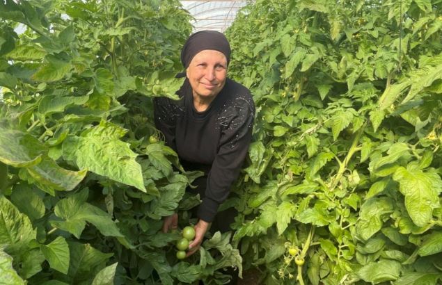 Sabah nous accueille avec un sourire franc et de l’optimisme dans les yeux. Elle nous montre fièrement la croissance de ses cultures et nous indique plusieurs plants de tomates sur le point de mûrir. En tant qu’agricultrice et unique soutien de son foyer, Sabah se consacre à ses trois serres qui l’aident à subvenir aux besoins de sa famille.