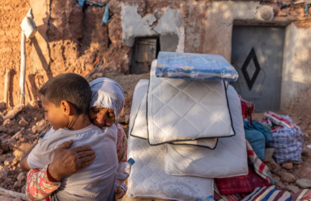 Une femme réconforte un enfant devant une maison détruite à la suite d’un tremblement de terre à Tafeghaghte, dans la région d’Al Haouz au Maroc, le dimanche 10 septembre 2023. Cette catastrophe porte un coup terrible à ce pays de 37 millions d’habitants qui se considère comme un îlot de stabilité en Afrique du Nord. (Photographe : Nathan Laine/Bloomberg).