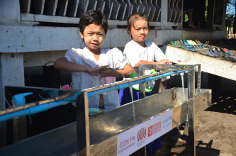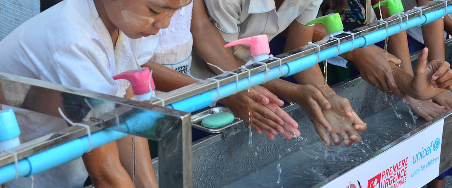Mise en place d’un point d’eau pour se laver les mains dans une école de Dala, région de Yangon, Myanmar ©Première Urgence Internationale